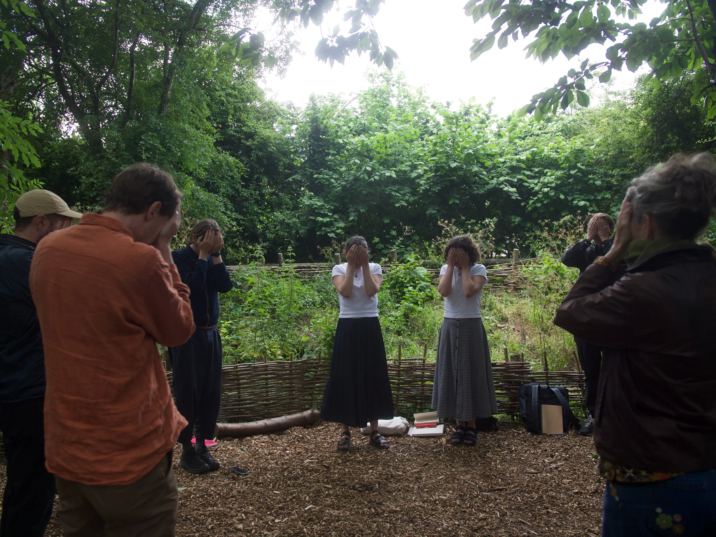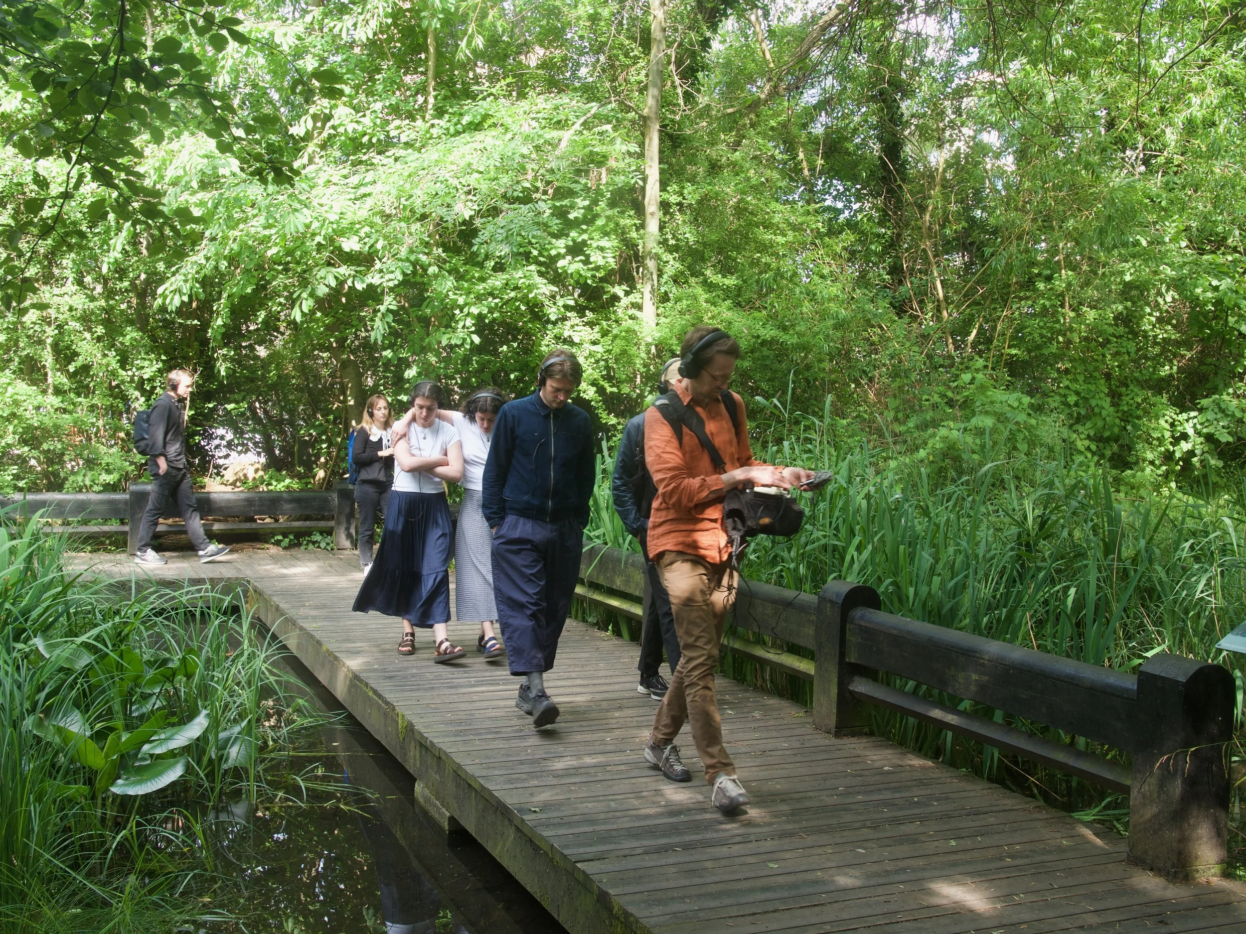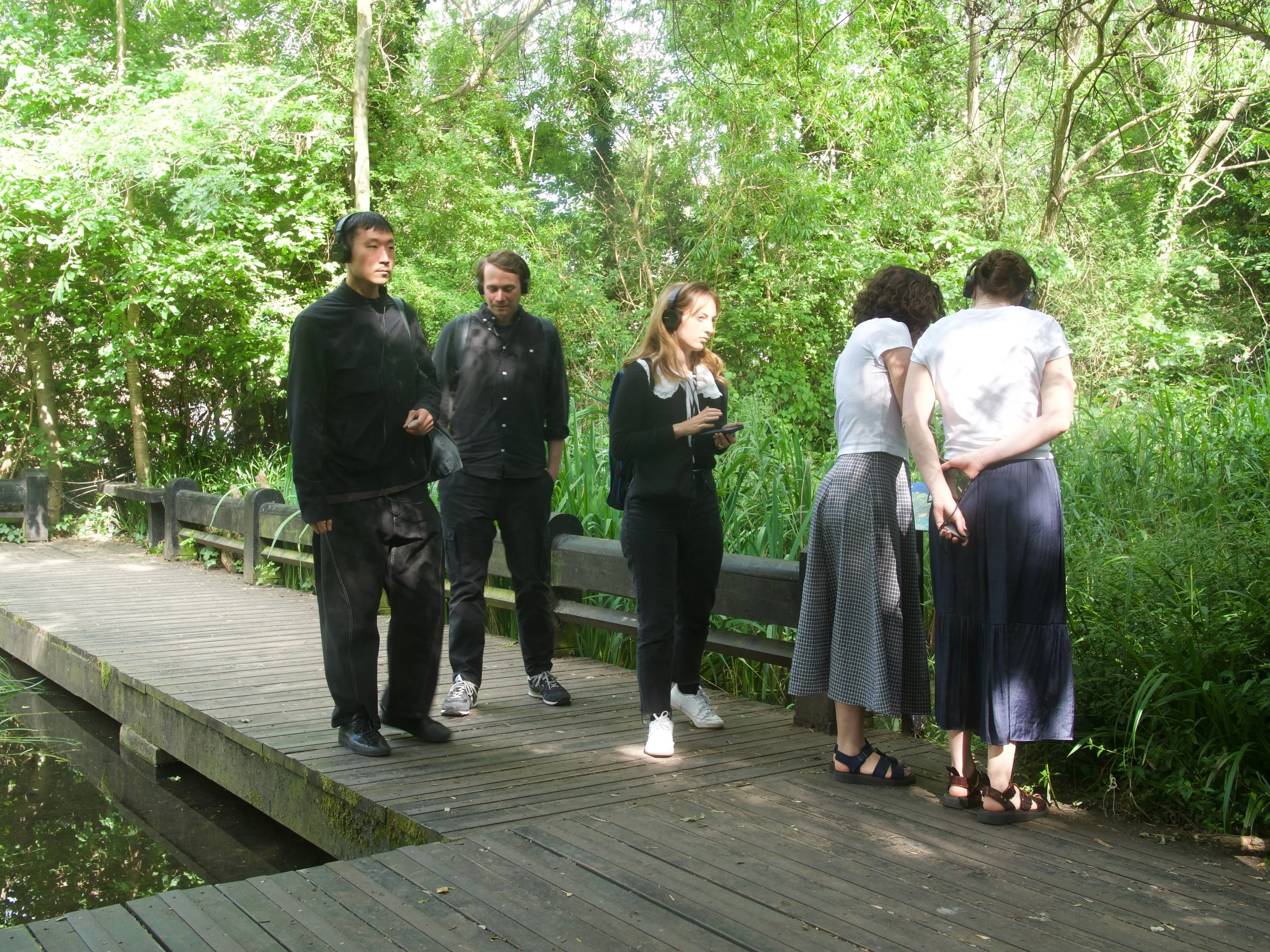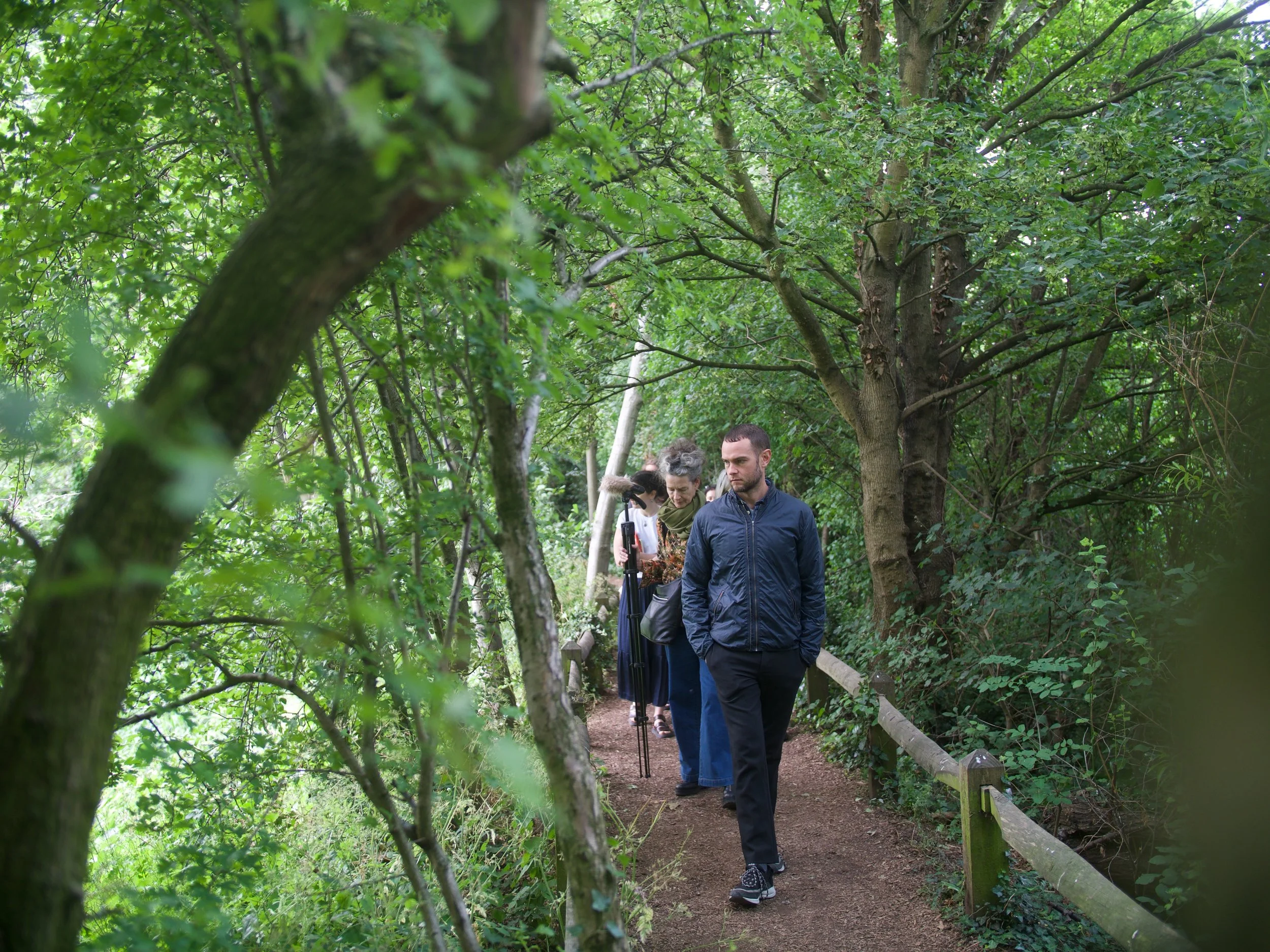 Tentacular Listening is an extended listening and reading walk. It engages cross-pollinating practices of collective reading and extended listening. After a series of warmups derived from Deep Listening, of which De Little is a registered practitioner, the group explored Camley Nature Reserve whilst attempting to listen beyond a usual anthropocentric aural perspective by using the hands to tune into what might be audible beyond the surfaces of plants and materials.